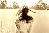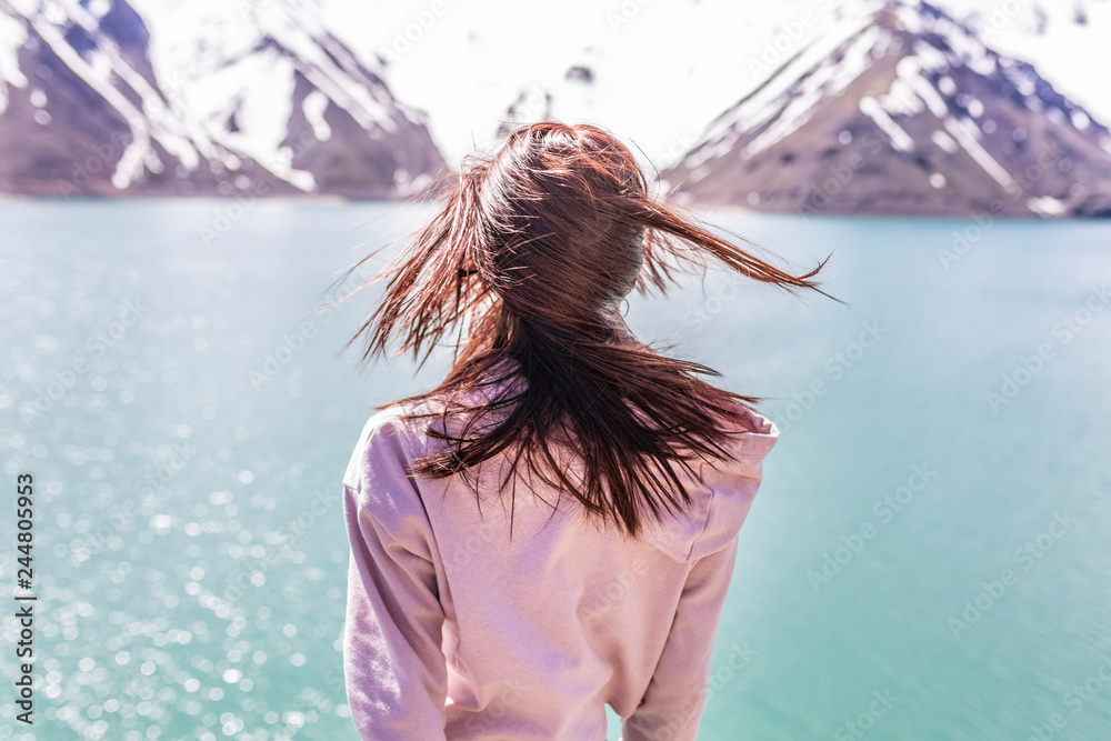 Girl looking at the amazing mountain view. with messy windy hair Turquoise waters of "Embalse del Yeso" (Cast Lake) at Santiago de Chile city in Andes mountains. Snow mountains and water reflections
