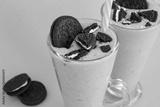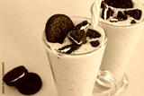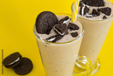 Milkshake with chocolate biscuit and cocoa in the glass on the yellow background.Closeup.