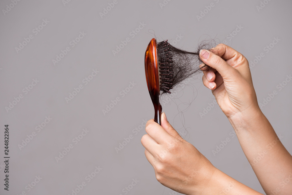 Healthcare concept. Woman show her brush with long loss hair and pulling her hair from brush.