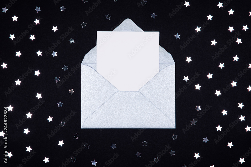 White blank card in opened silver grey envelope on black background decorated with star confetti.