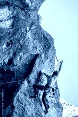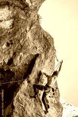 The last movements to reach the summit by a male climber. Rock climbing inside the Andes mountains at Cajon del Maipo, Chile. Climber solving the movements of "Annunaki" route a 8b french difficulty