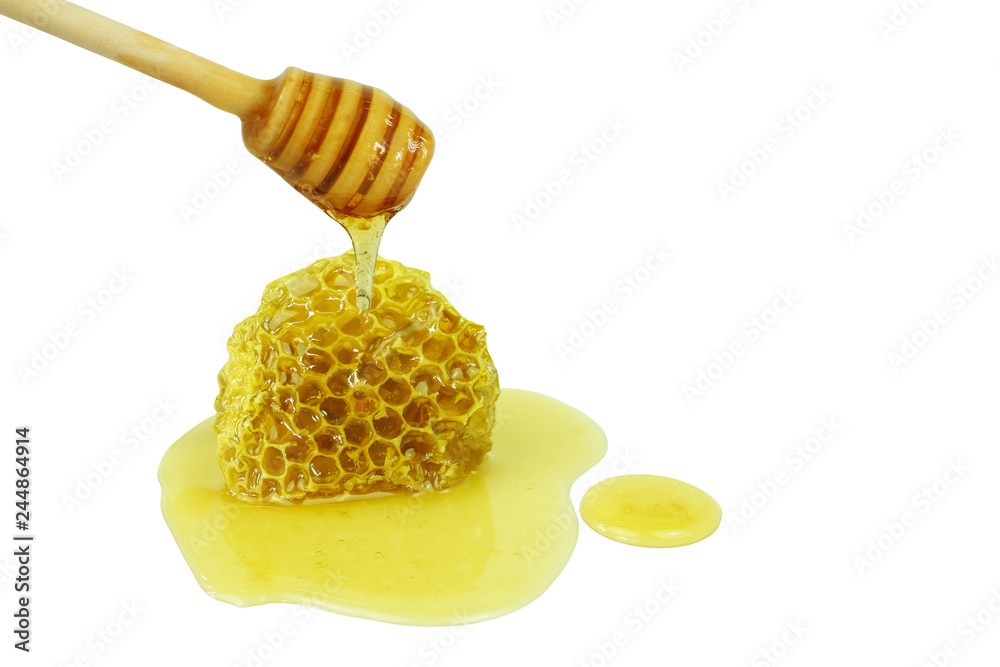 Honey dripping on wooden dipper pouring on honeycomb isolated on a white background, concept of bee products, natural ingredients.