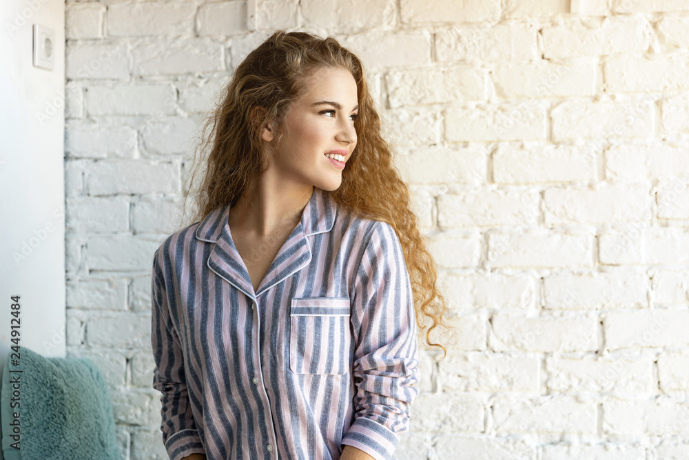 Portrait of cheerful girl in pyjamas spending morning at home in cozy atmosphere. Smiling model standing on white brick wall. Happiness and interior concept