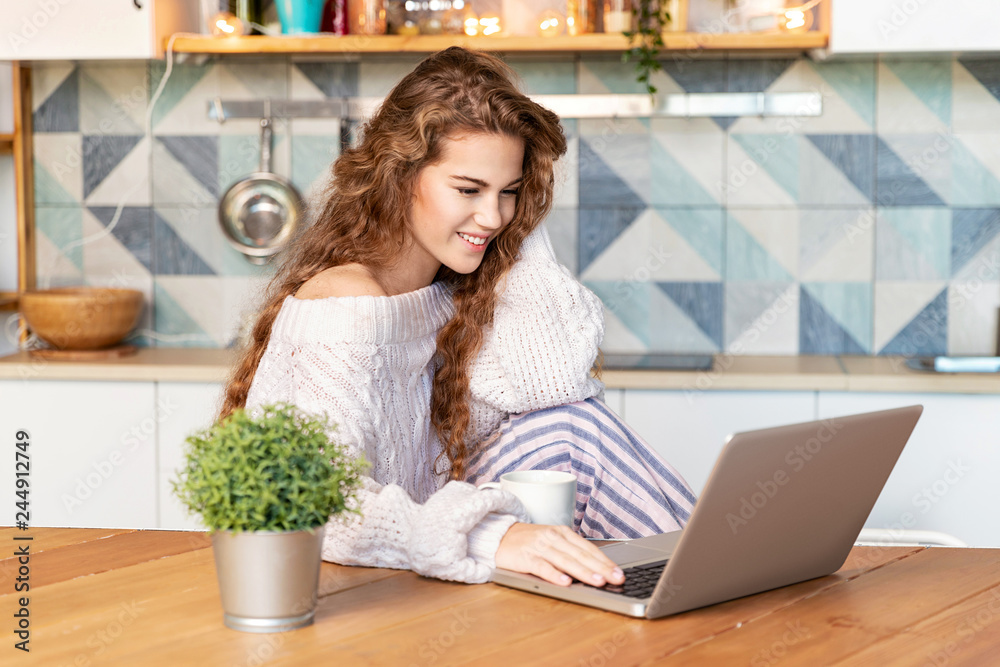 Portrait of young pretty model sitting on cozy kitchen at home and studying on laptop. Cute girl with cup of coffee. Modern interior and technology concept. Blurred background