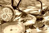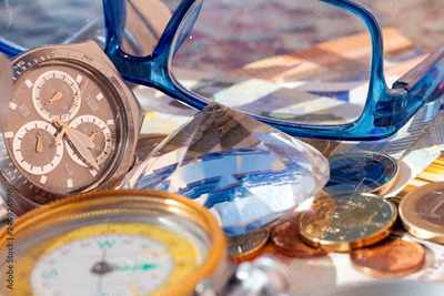 Signs of wealth: Euro banknotes, coins, credit card, jewelry, diamonds