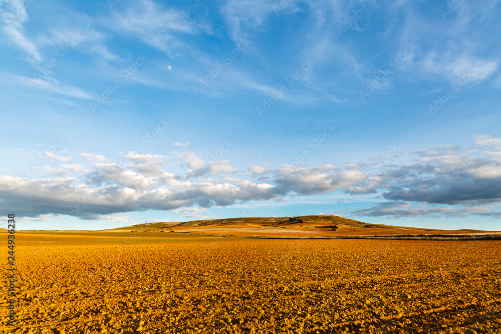 Campos de cultivo de secano, lomas y cielo azul con nubes. Comarca de Los Oteros.