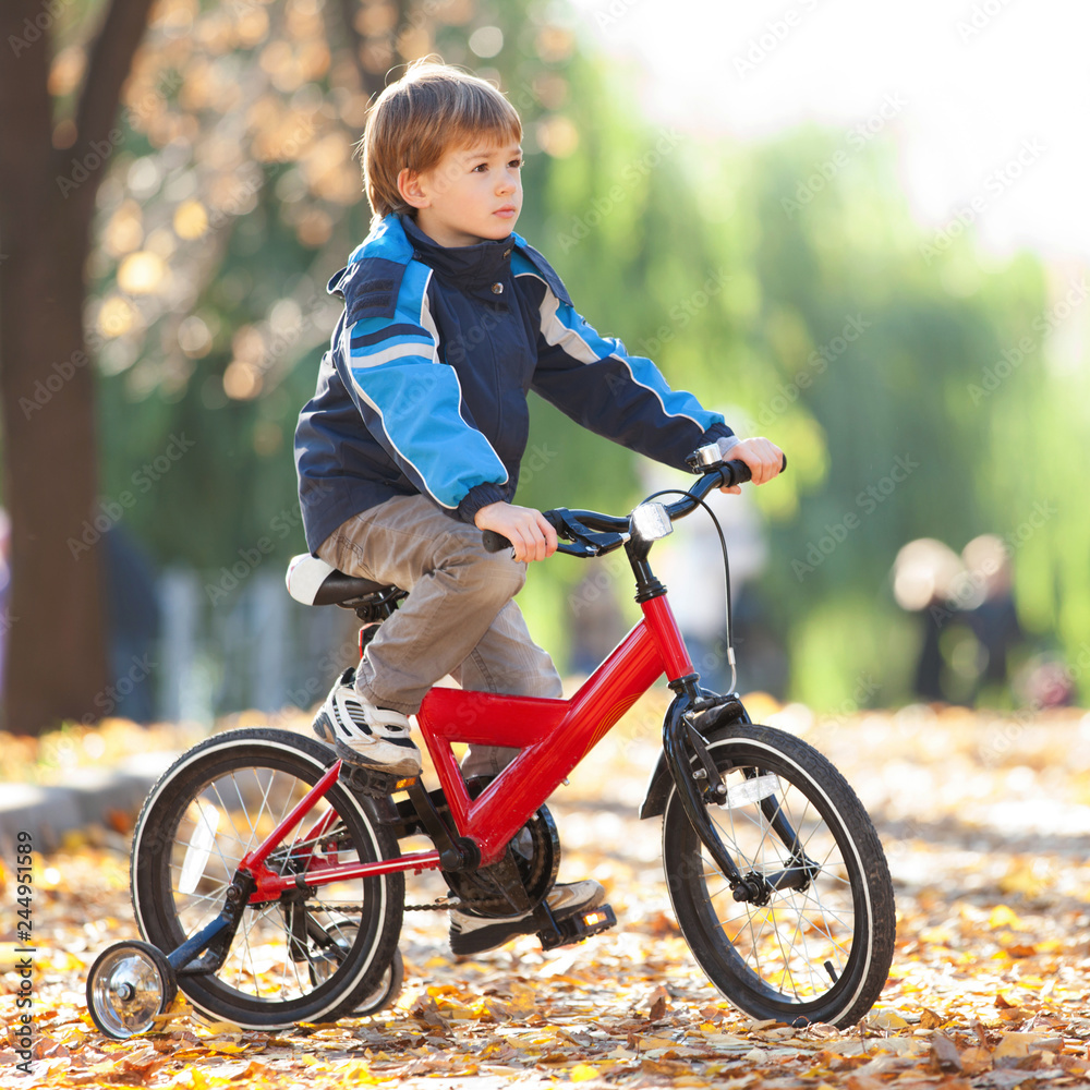 Happy boy with bicycle in the autumn park. Beauty nature scene with colorful foliage background, yellow trees and leaves at fall season. Autumn outdoor lifestyle. Boy having fun on fall leaves