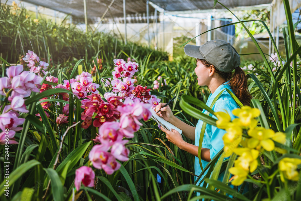 The girl notes the changes, orchid growth in the garden. Beautiful (Orchid) background in nature