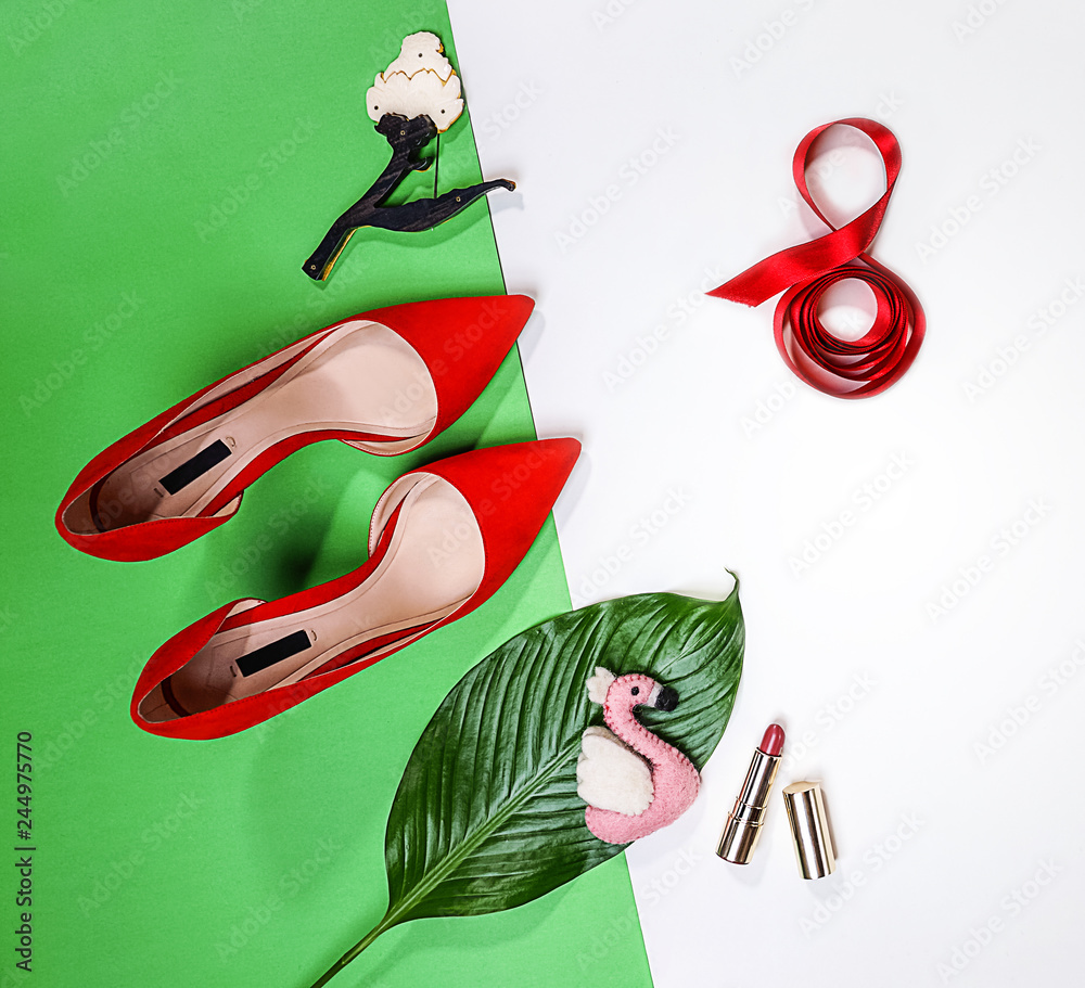 Flat lay to spring summer Valentine's Day 8 March party outfit layout female red shoes accessories cosmetics makeup leaf and pink flamingo toy on green white background. Top view copy space horizontal