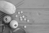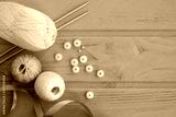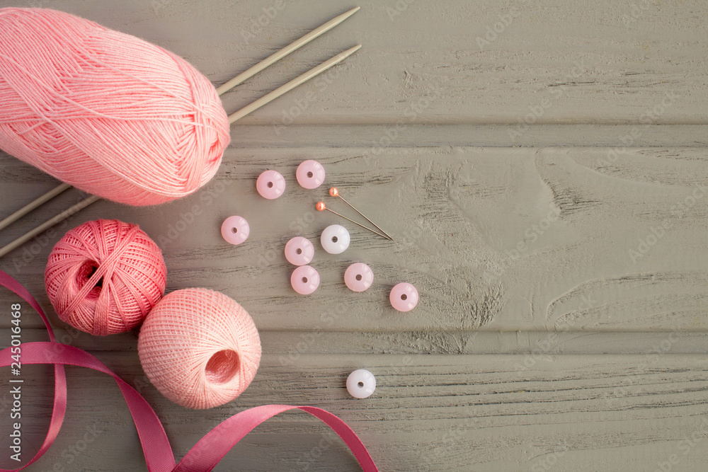 Pink knitting and knitting needles on the grey wooden background.Top view.Copy space.