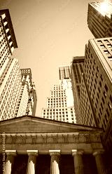 Looking up at Wall Street buildings, color toned picture, New York, USA.