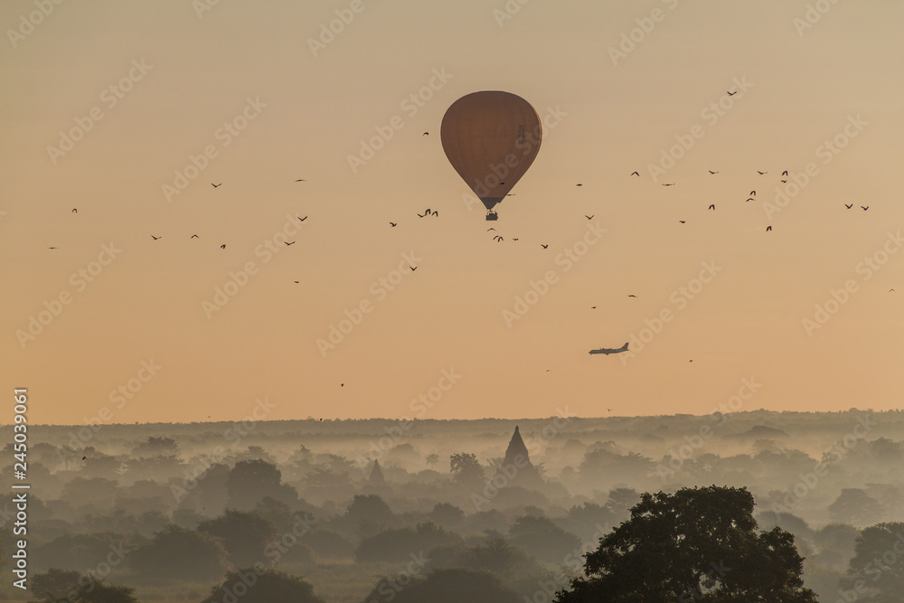 Balloon over Bagan, landing airplane and the skyline of its temples, Myanmar