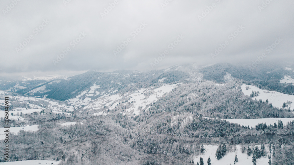 Aerial drone shot of the mountain hills and pine forest covered with snow. Carpathian mountains. Beautiful landscape view