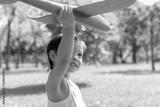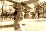 Little child is playing toy airplane at park in evening. Cute boy want to be pilot when little boy grow up. Lovely boy holding toy airplane and lift it like a flying. He get happiness with smile face