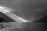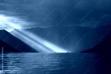 Incredible summer or spring storm with sun rays among mountains and beautiful sea or ocean. Amazing landscape during rainy season and monsoon weather. Montenegro, the Bay of Kotor.