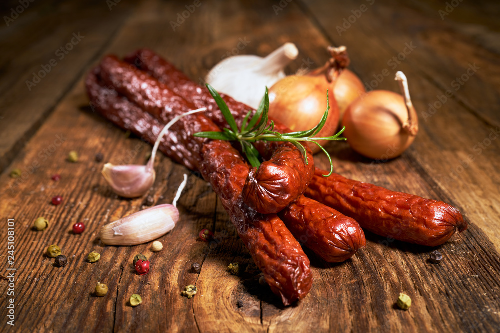 Smoked sausage on a wooden rustic table with the addition of fresh aromatic herbs and spices, natural product, produced by traditional methods
