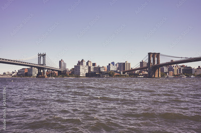 Brooklyn Borough seen between two famous New York bridges, Manhattan Bridge and Brooklyn Bridge, retro color toned picture, USA.