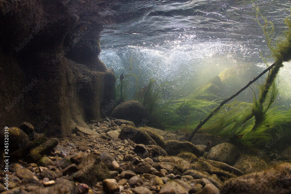 Rocks underwater on riverbed with clear freshwater. River habitat. Underwater landscape. Mountain river. Litle stream with gravel. Underwater scenery, algae, mountain river cleanliness.