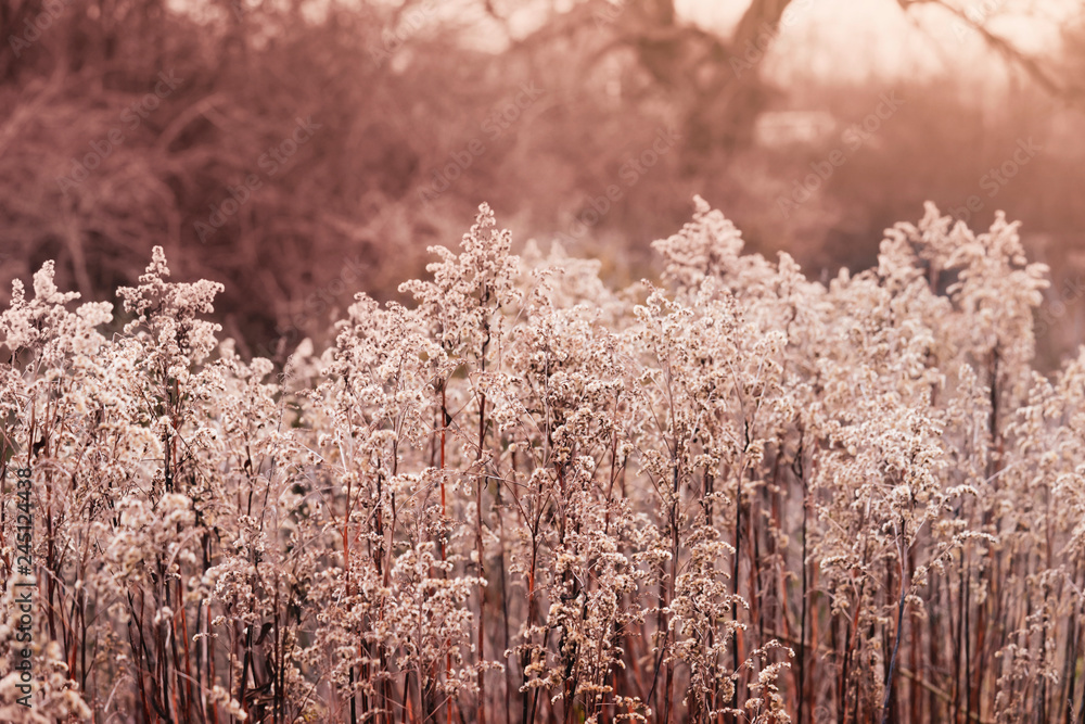 Soft focus of dry wild flower in the winter on dark pink and dark orang tone, Selective focus of dried flowers in winter forest, New colour tone with copy space for Valentines background