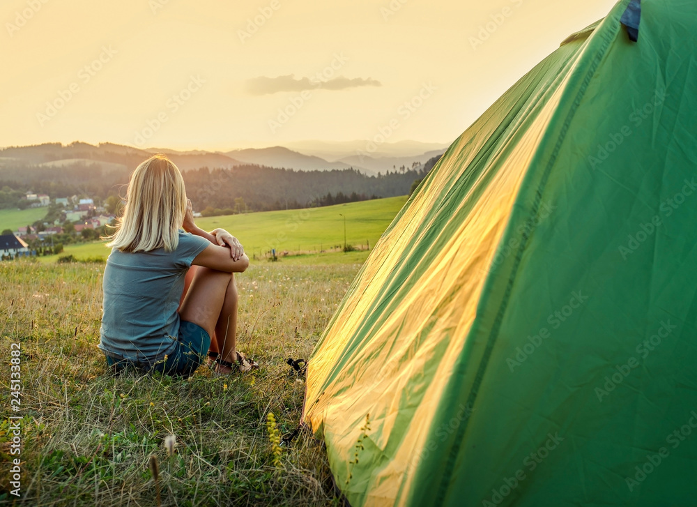 Happy woman with open arms sitting near tent around mountains under sunlight