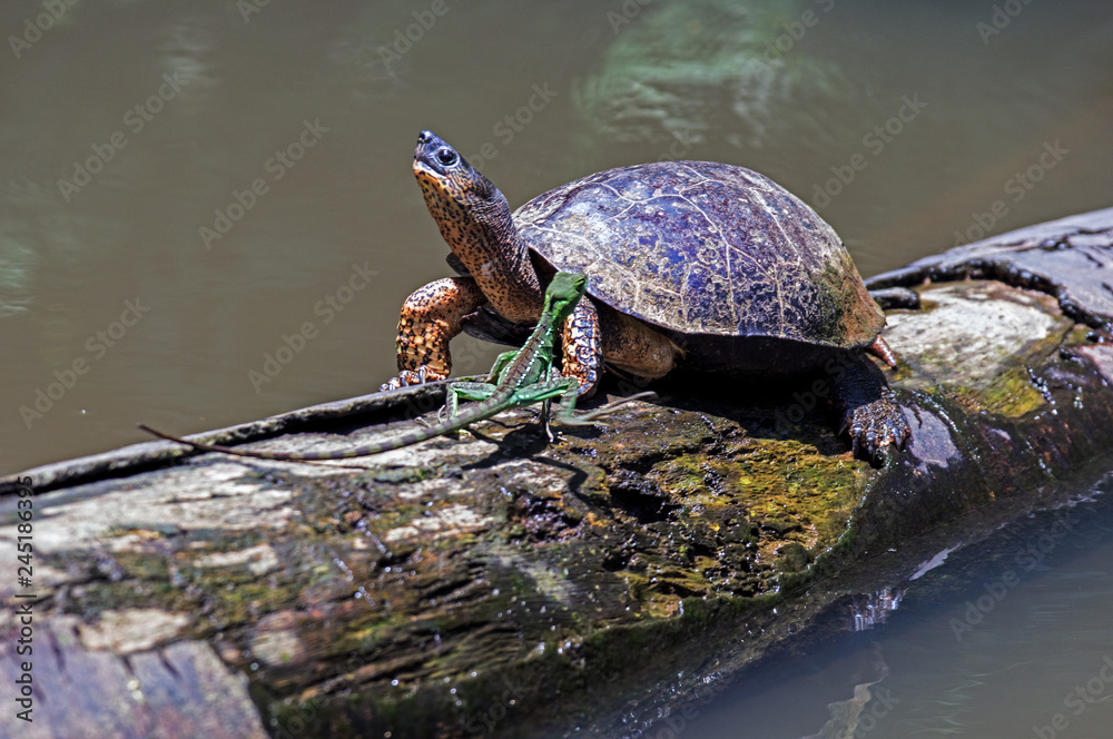 A River Turtle met a running lizard on a log in natural rainforest canal at Tortuguero National Park - Costa Rica