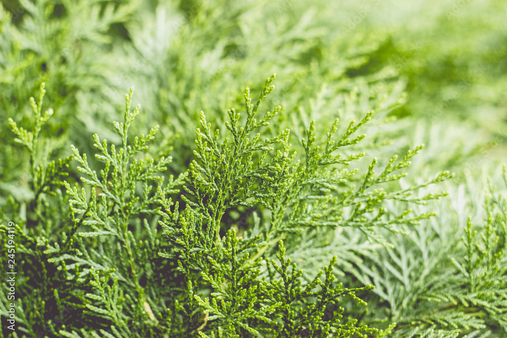 Close up of a branch of thuja tree; nature background