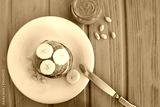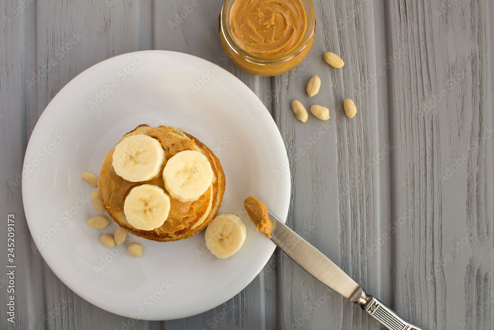Homemade pancakes with peanut paste and banana in the white plate on the grey wooden background.Top view.Copy space.