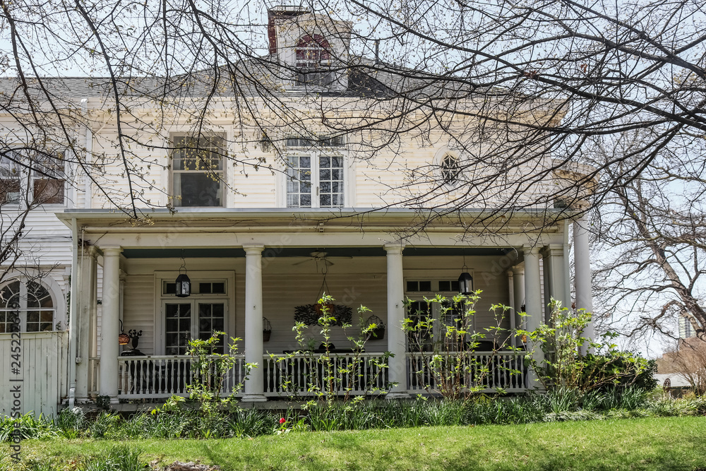 Old stately but shabby wooden home in early spring with budding branches and flowers starting to grow up around it in disarray