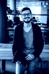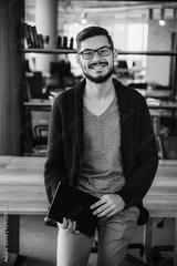 Portrait of a handsome smiling and stylishly dressed guy with glasses and a tablet in hand indoors