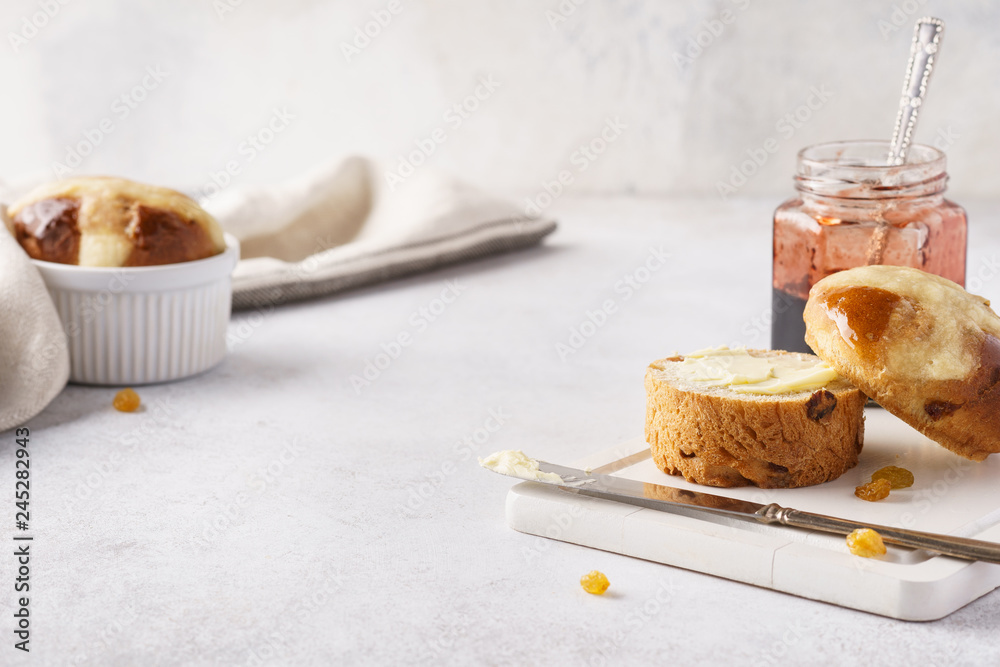 Homemade cross buns, butter and jam for Easter breakfast.