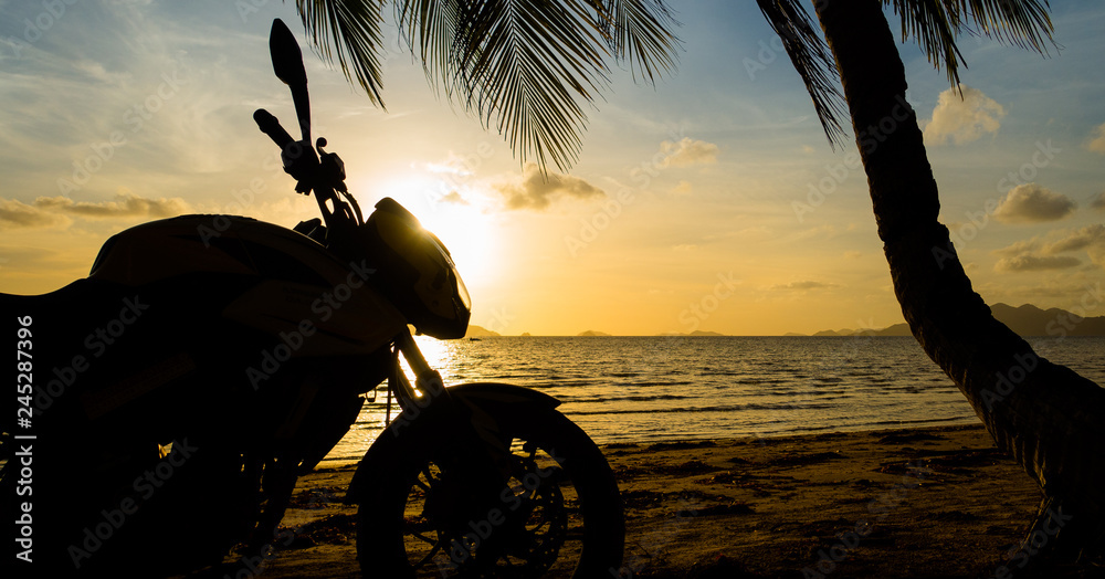 Road Bike Motorcycle Silhouette Parked With Palm Tree on Sunset Beach - El-Nido, Palawan - Philippines