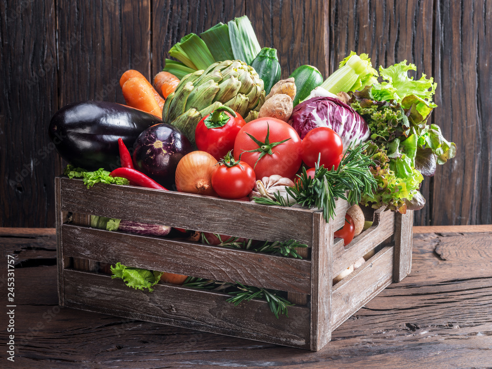 Fresh multi-colored vegetables in wooden crate. Wooden background.