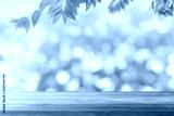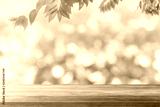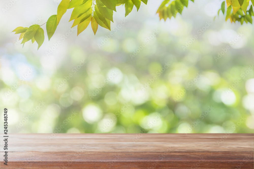 Empty wood table top and blurred view from green tree garden bokeh background - can used for display or montage your products.