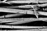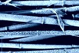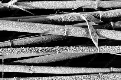 Monochrome frosted stems of the bamboo plant in winter. Black and white background.