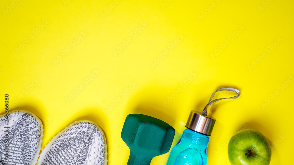 Top view layout with fitness equipment and space for text on yellow color background. healthy and active lifestyles love concept sports sneakers, bottle of waters apple dumbbell. Copy space, flat lay