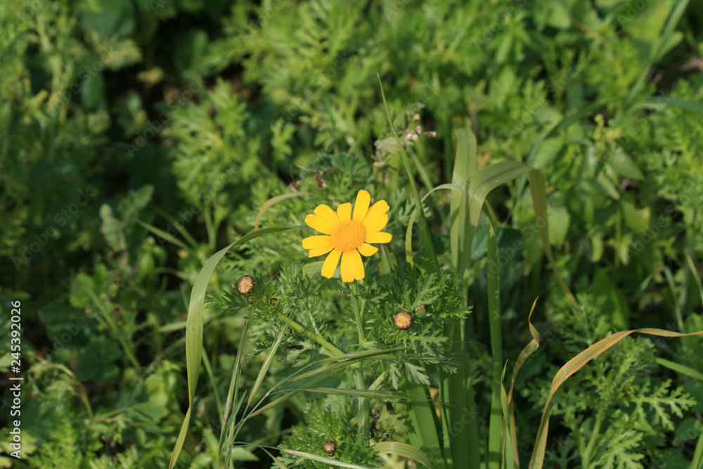 Yellow wildflower among green leaves