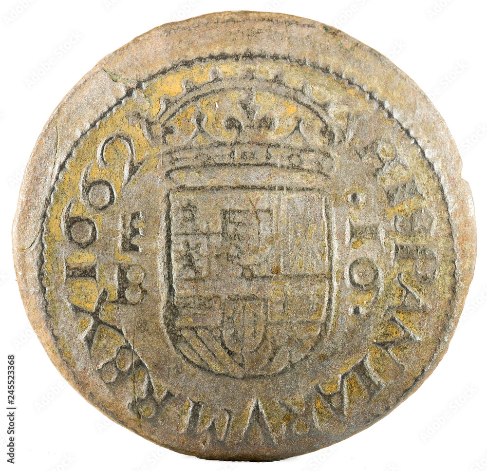 Ancient Spanish copper coin of King Felipe IV. 1662. Coined in Segovia. 16 Maravedis. Reverse.