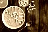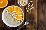 Breakfast: oatmeal with orange and peanuts in the white bowl on the brown wooden background.Top view.Copy space.