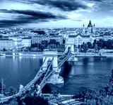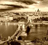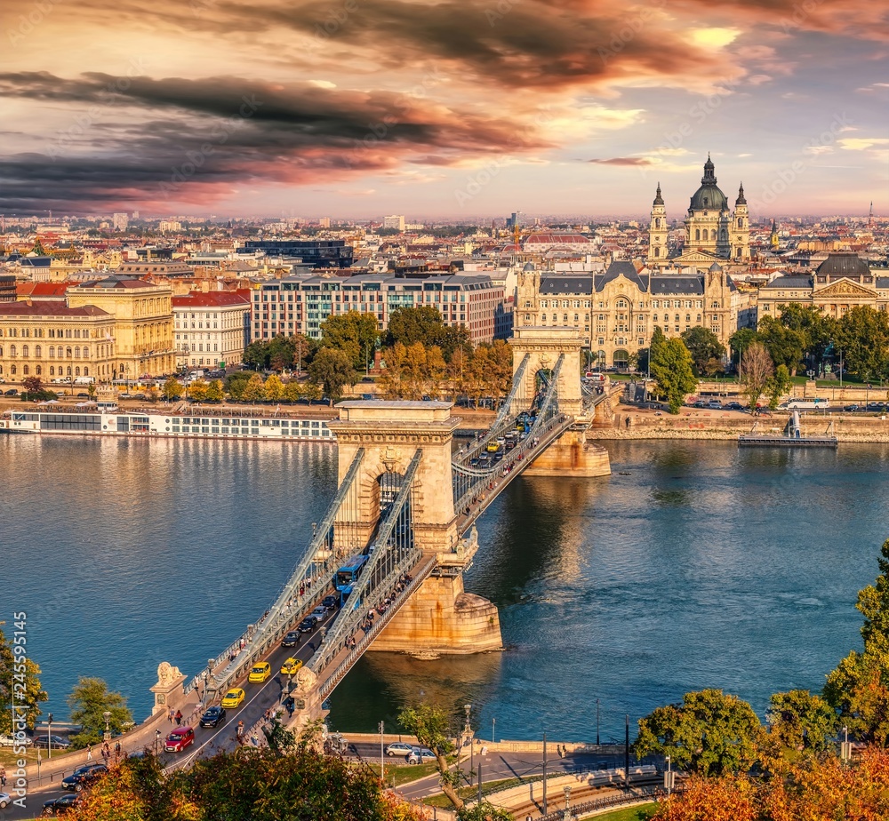 Beautiful sunset over the capital city of Hungary, Budapest. Aerial view with the Danube river and the Chain Bridge.