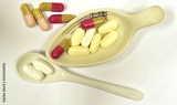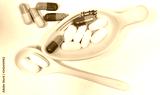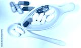 tabletten in tablettenschälchen und löffel vor weißem hintergrund