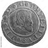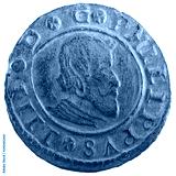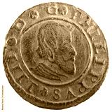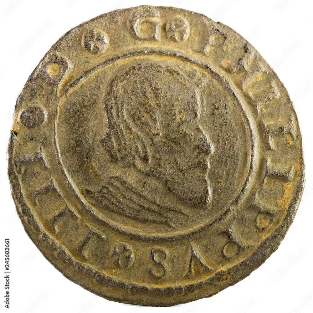 Ancient Spanish copper coin of King Felipe IV. 1664. Coined in Madrid. 16 Maravedis. Obverse.