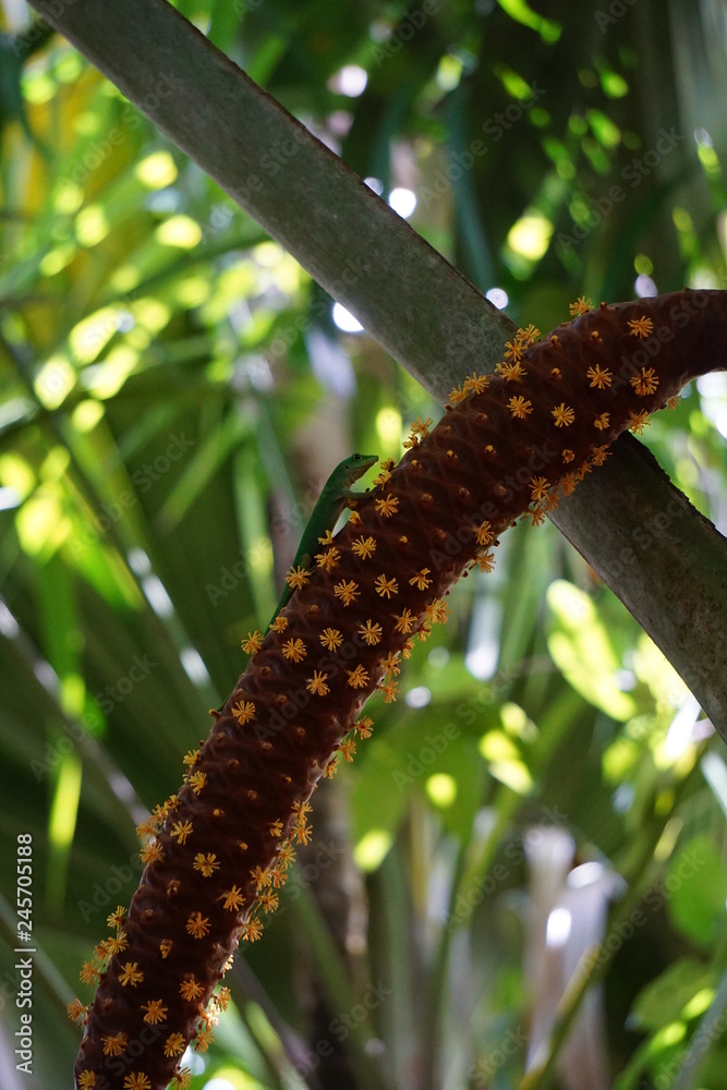 Day gecko on male inflorescence of Coco de Mer palm tree