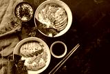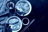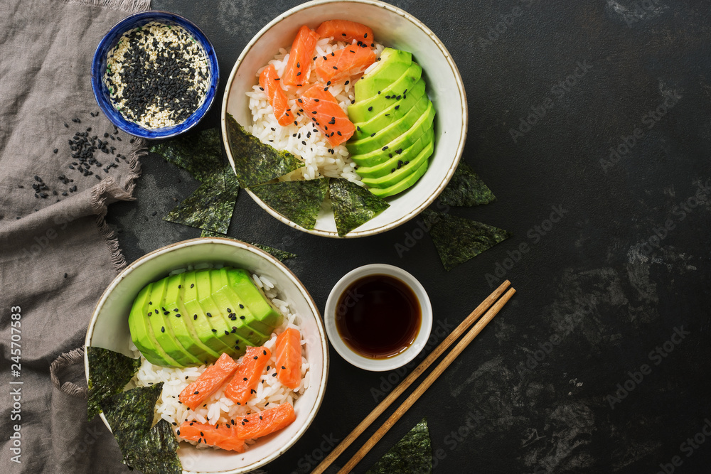Poke bowl with Hawaiian salmon rice, avocado, nori, on a dark stone background. Traditional Hawaiian raw fish salad.Sushi bowl. Top view, flat lay.
