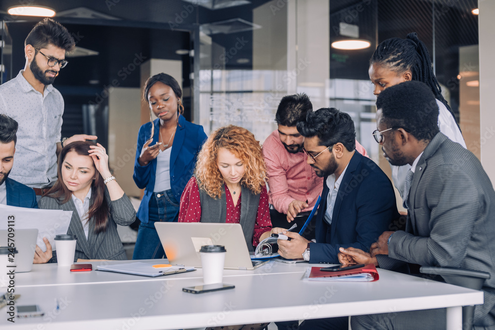 Creative multiracial business team discussing project, standing around workplace, while two co-workers with portable computers looking for needed information, sharing results to the workers