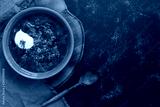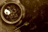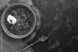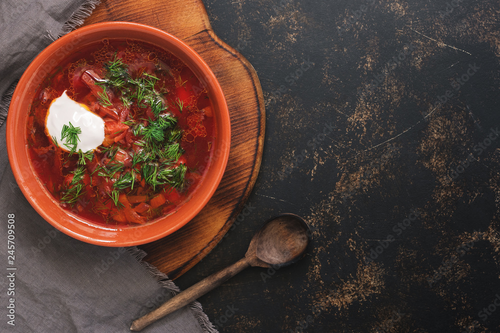 Red soup borscht on a dark rustic background, traditional Russian and Ukrainian food. Top view, copy space.