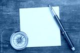 Compass with clean napkin and a metal ballpoint pen on grey background