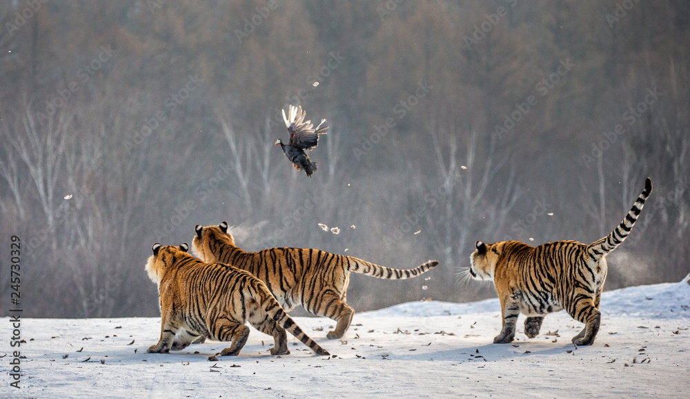 Siberian tigers in a snowy glade catch their prey. Very dynamic shot. China. Harbin. Mudanjiang province. Hengdaohezi park. Siberian Tiger Park. Winter. Hard frost. (Panthera tgris altaica)