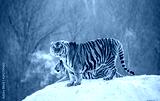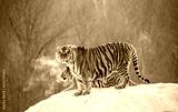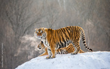 Pair of Siberian tigers on a snowy hill against the backdrop of a winter forest. China. Harbin. Mudanjiang province. Hengdaohezi park. Siberian Tiger Park. Winter. Hard frost. (Panthera tgris altaica)