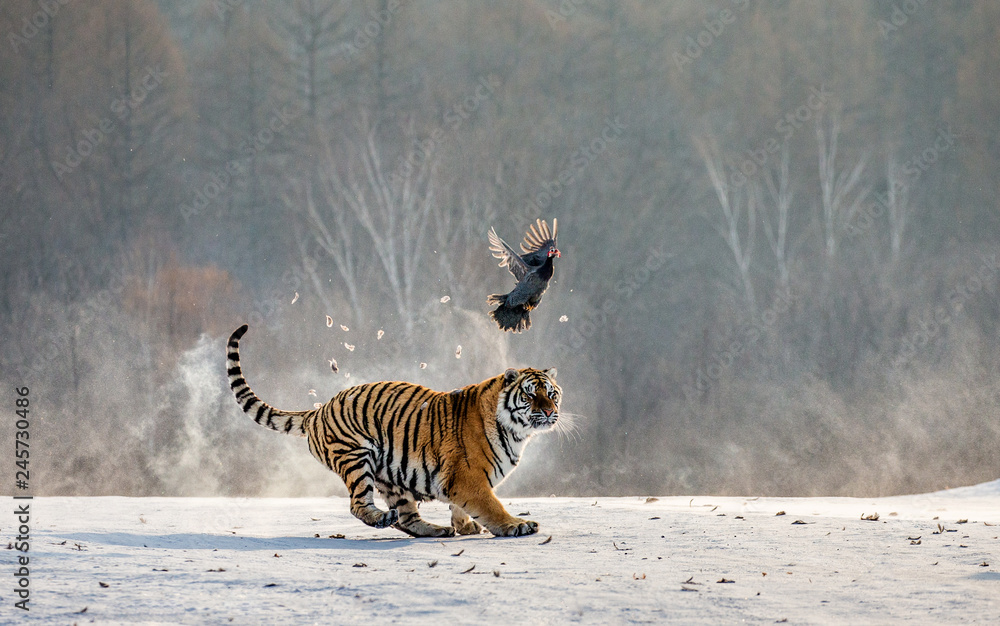 Siberian Tiger in a snowy glade catch their prey. Very dynamic photo. China. Harbin. Mudanjiang province. Hengdaohezi park. Siberian Tiger Park. Winter. Hard frost. (Panthera tgris altaica)