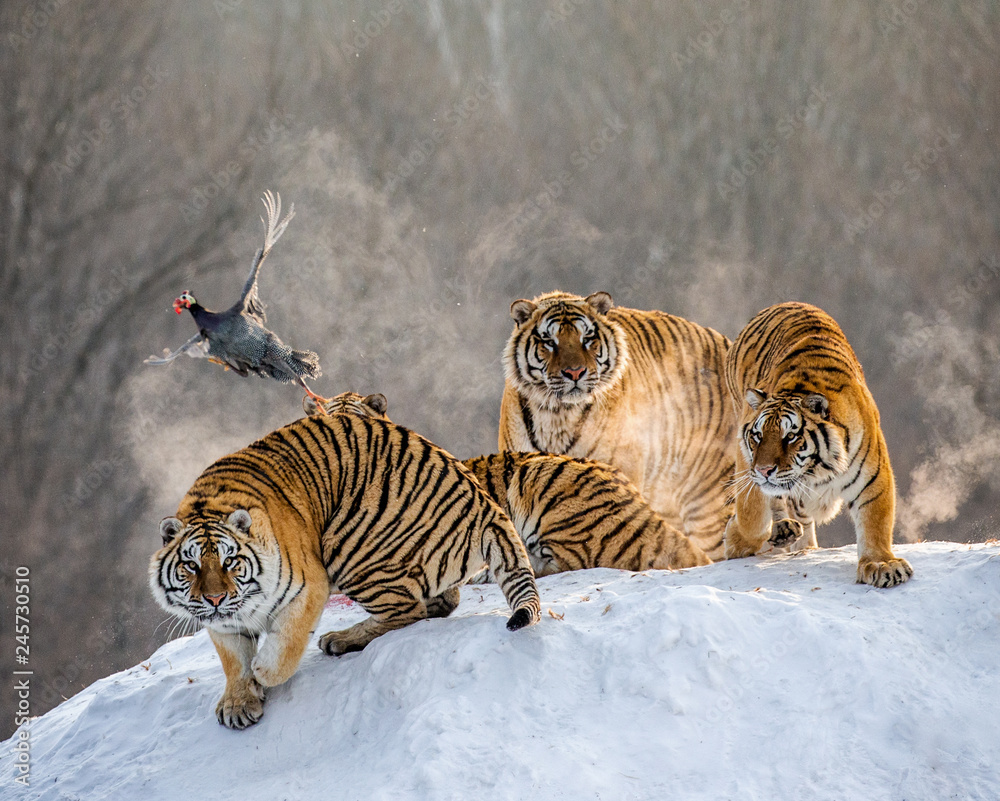 Several siberian tigers are standing on a snow-covered hill and catch prey. China. Harbin. Mudanjiang province. Hengdaohezi park. Siberian Tiger Park. Winter. Hard frost. (Panthera tgris altaica)